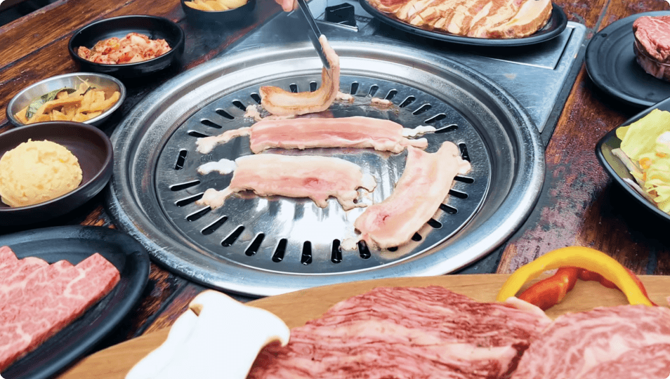 The Korean BBQ experience seen in dramas comes to life here, with sizzling grills, shared dishes, and a table made for enjoying food together.